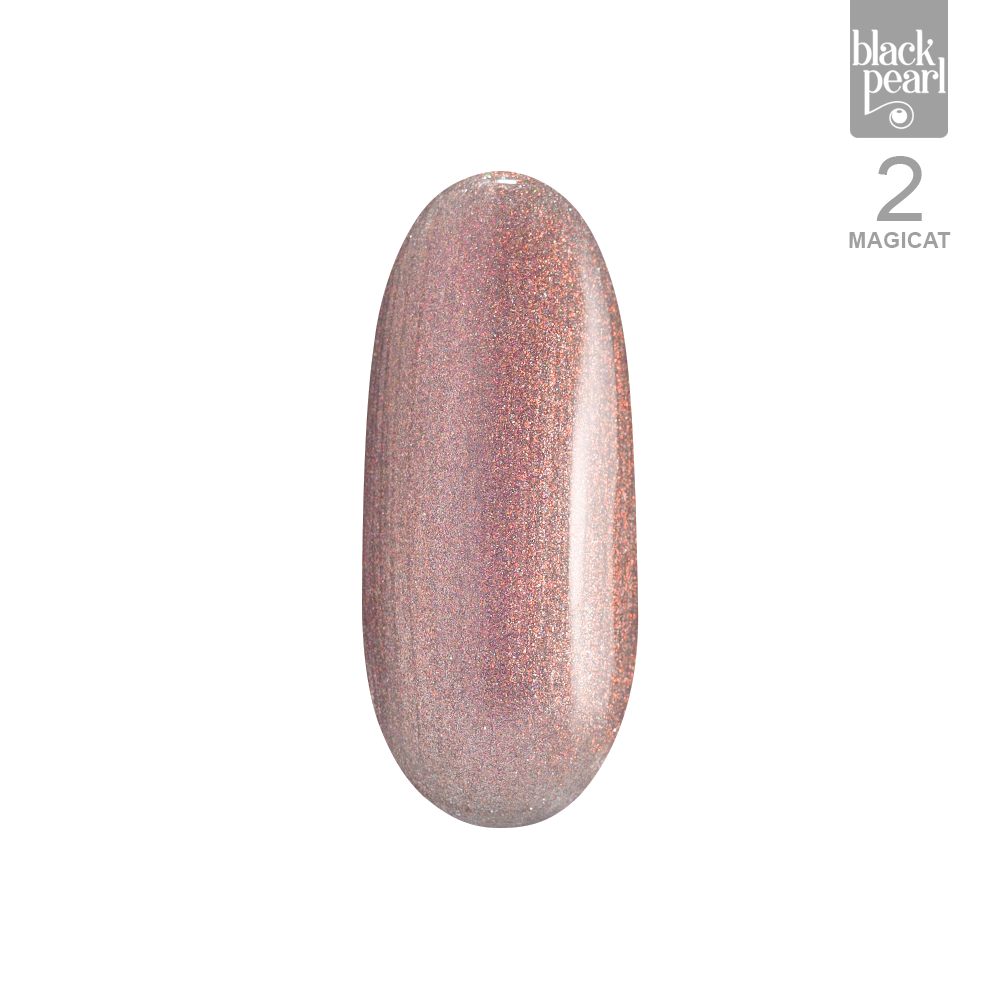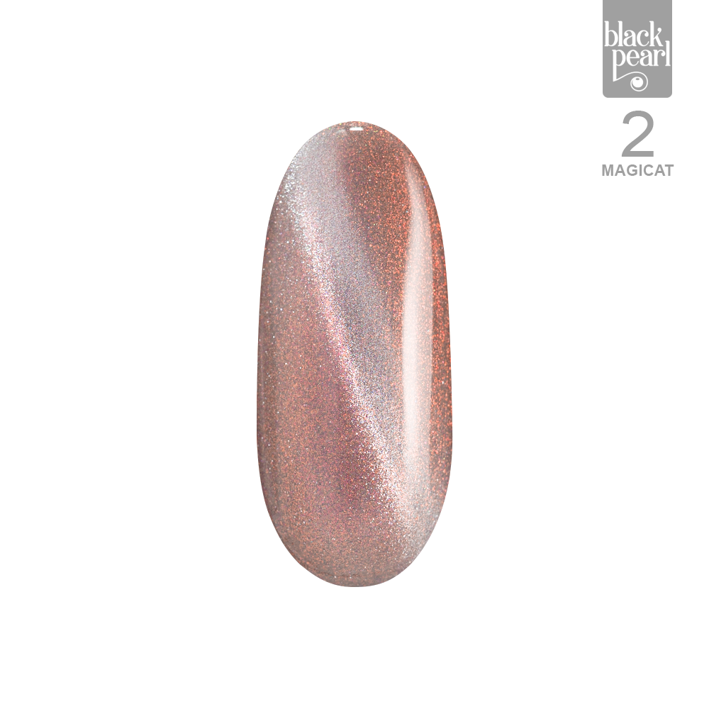 MagiCat 02 to lakier hybrydowy w odcieniach pomarańczy i miedzi z efektem cat eye, który tworzy spektakularny, zmieniający się efekt światła na paznokciach.