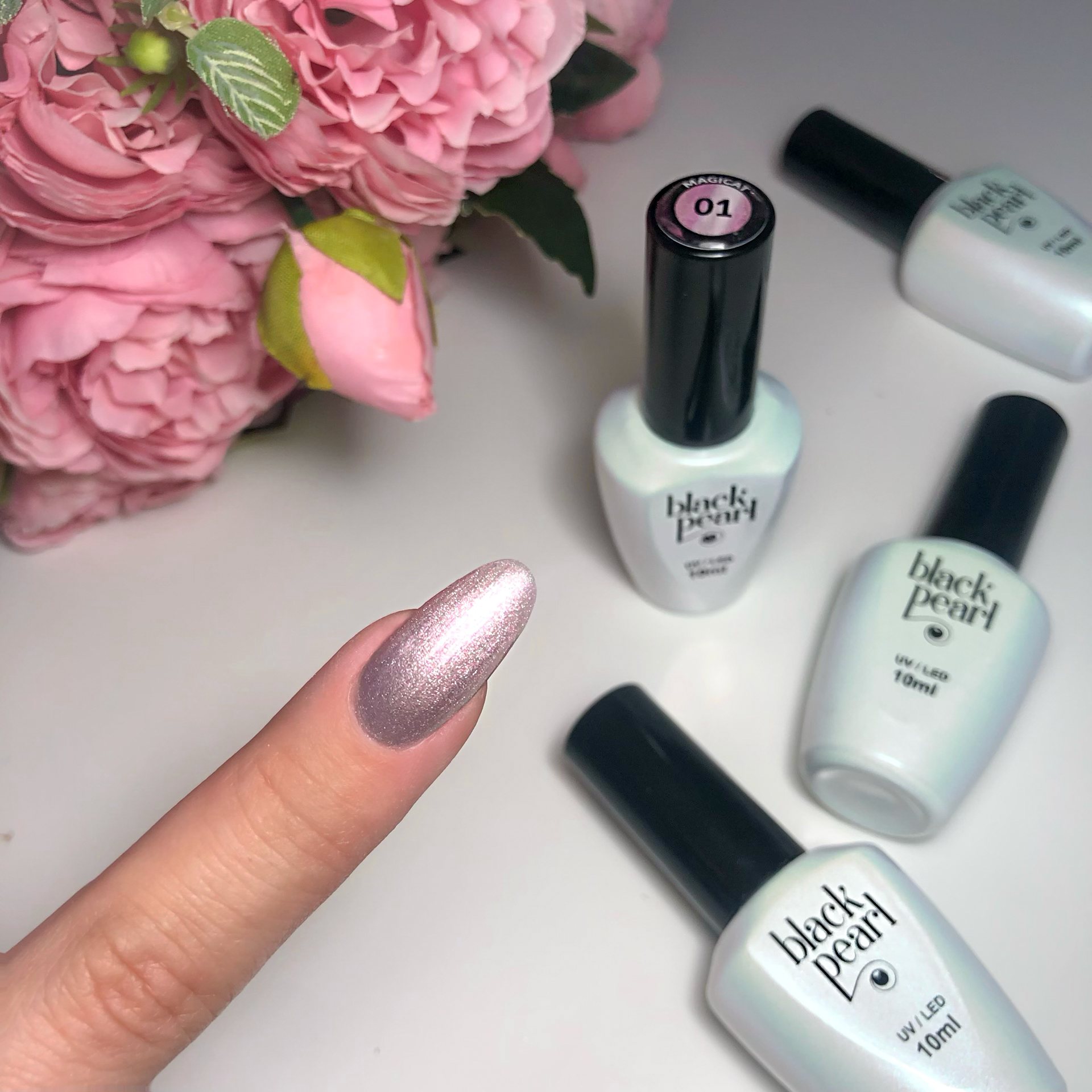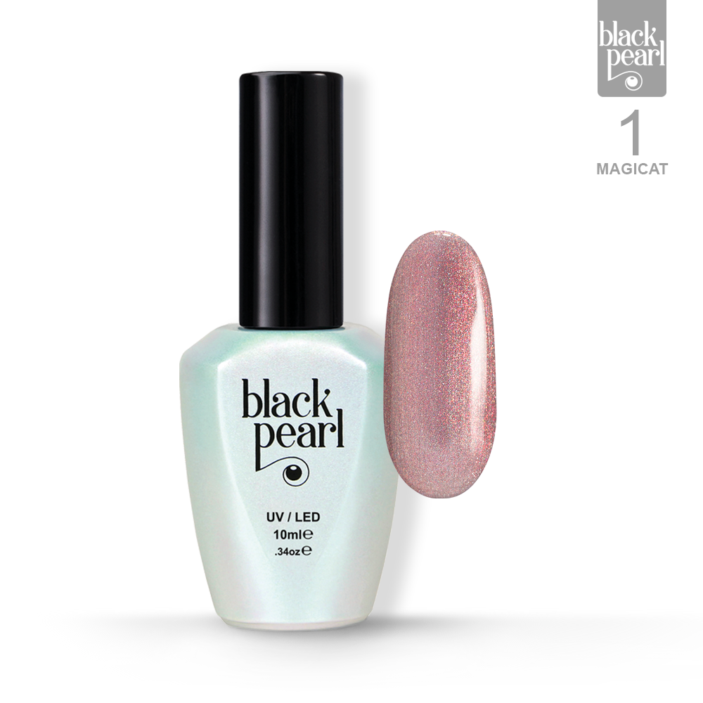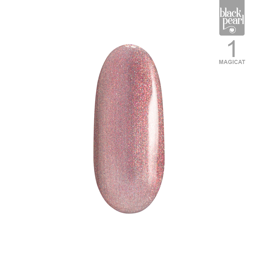 MagiCat 01 to różowy lakier hybrydowy z efektem cat eye, który tworzy wielowymiarowy, zmieniający się efekt światła na paznokciach.