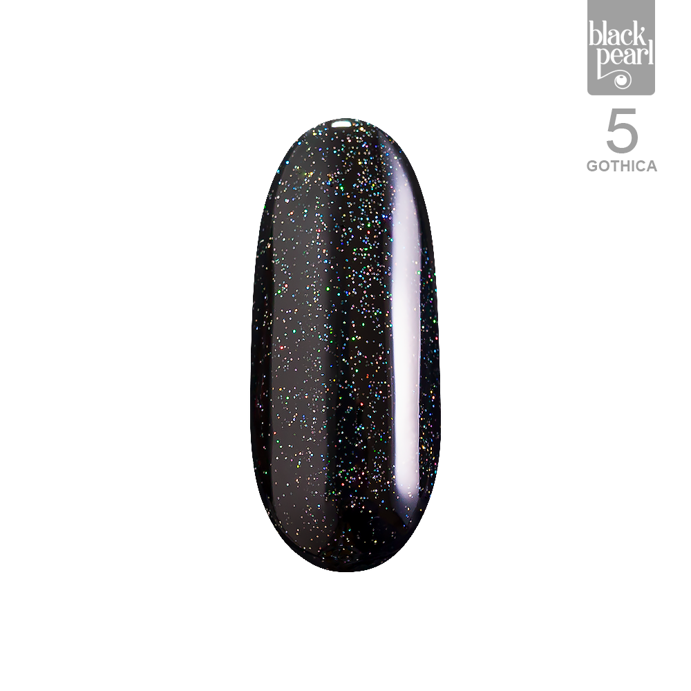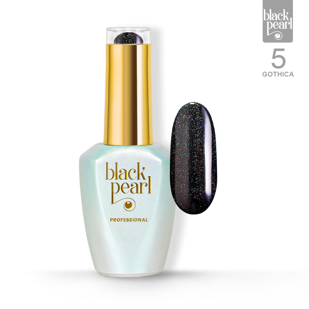 Gothica 5 to lakier hybrydowy w głębokim, czarnym odcieniu wzbogacony o wielokolorową drobinkę, która tworzy spektakularny efekt zmieniających się refleksów.