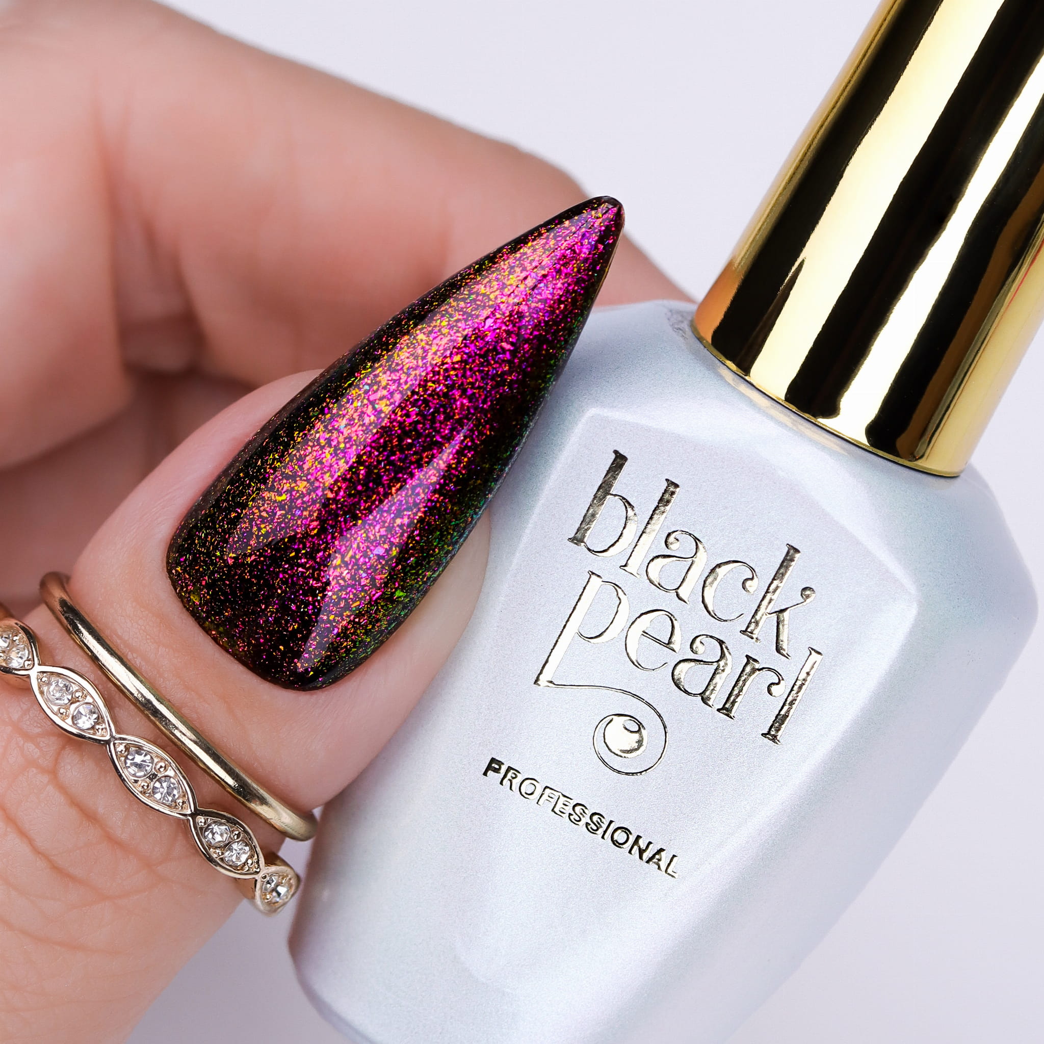 Drobinki mienią się odcieniami różu, fioletu, złota i pomarańczu, tworząc efekt kameleona, który przyciąga uwagę i daje efekt „wow” już przy pierwszym spojrzeniu.