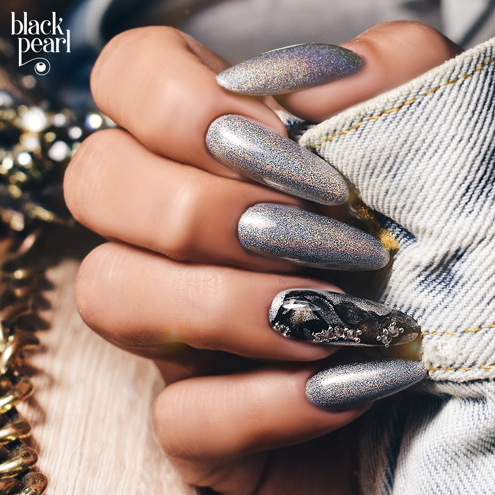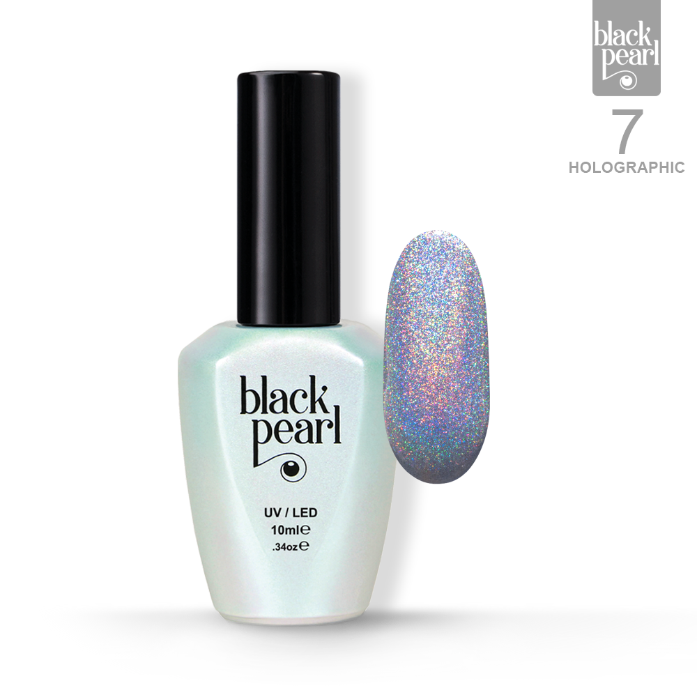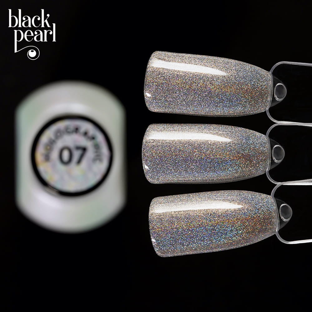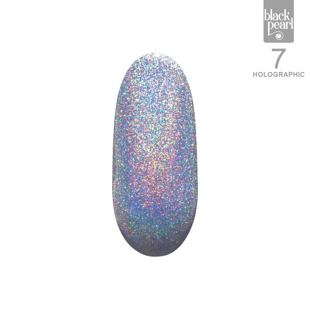 Lakier hybrydowy 07 Holographic to klasyczny srebrny odcień w intensywnej, holograficznej odsłonie, który zapewnia wyjątkowo mocny efekt wizualny.