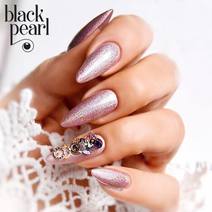 Stylizacja zyskuje elegancki, rozświetlony charakter, a paznokcie wyglądają jak pokryte drobinkami światła.